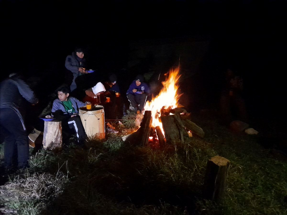Foto's: De jongens van Adulam doen dagopening op kamp (linksboven); Kampvuur mocht niet ontbreken (rechtsboven); De meisjes in Talita Cumi brachten hun stem uit:, oefenen voor als het echt kan (linksonder); William en een ander kind uit Jesed wachten op hun beurt bij de oogarts (rechtsonder).